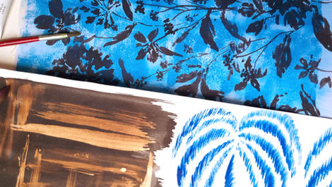 Alguns trabalhos manuais desenvolvidos para projetos do estúdio Anna Mendes Design e estudos pessoais feitos durante o curso de Drawing and Painting for Textile Design na UAL.